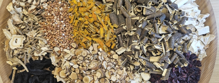 처방은 사육탕(사물탕과 육미지황탕의 합방)에 어깨관절에 도움이 되는 약재를 위주로 구성하였습니다. 사물탕은 혈액순환을 개선하며 육미지황탕은 간신을 보하여 만성피로에 활용합니다. 여기서 처방의 약재의 양을 조절하게 되는데, 택사의 양을 증량하여 몸의 습열을 더 빼는 역할을 하게 했으며, 복령의 양도 증량하여 노폐물을 배설하고 심신을 편안하게 하였습니다. 보사의 원리를 조절하여, 육미지황탕을 보약과 치료약의 개념을 함께 구사한 것입니다. 해동피는 만성관절질환에 활용하며, 오가피는 보간신강근골하는 효능이 있으며, 강황 오약은 견관절에 많이 활용하여 소통을 돕고 염증을 완화하는 효과가 있습니다. 숙지황은 보신하여 몸을 보강하고 만성질환을 개선하는 재료로 활용할 수 있습니다. 오염된 물을 제거하려면 오염도 제거해야 하지만 물의 공급도 있어야 하는 원리입니다.