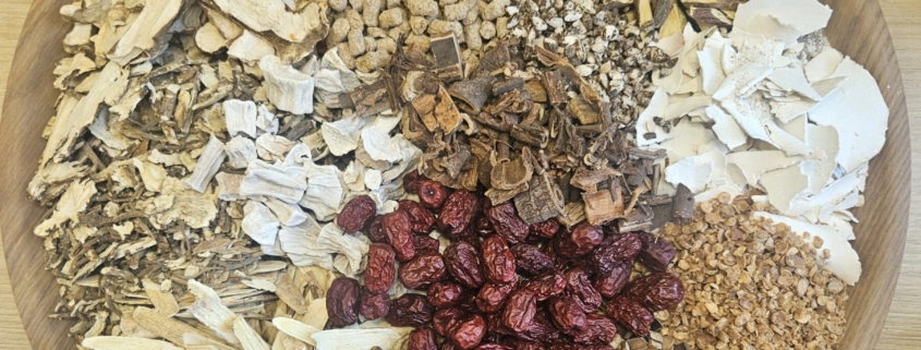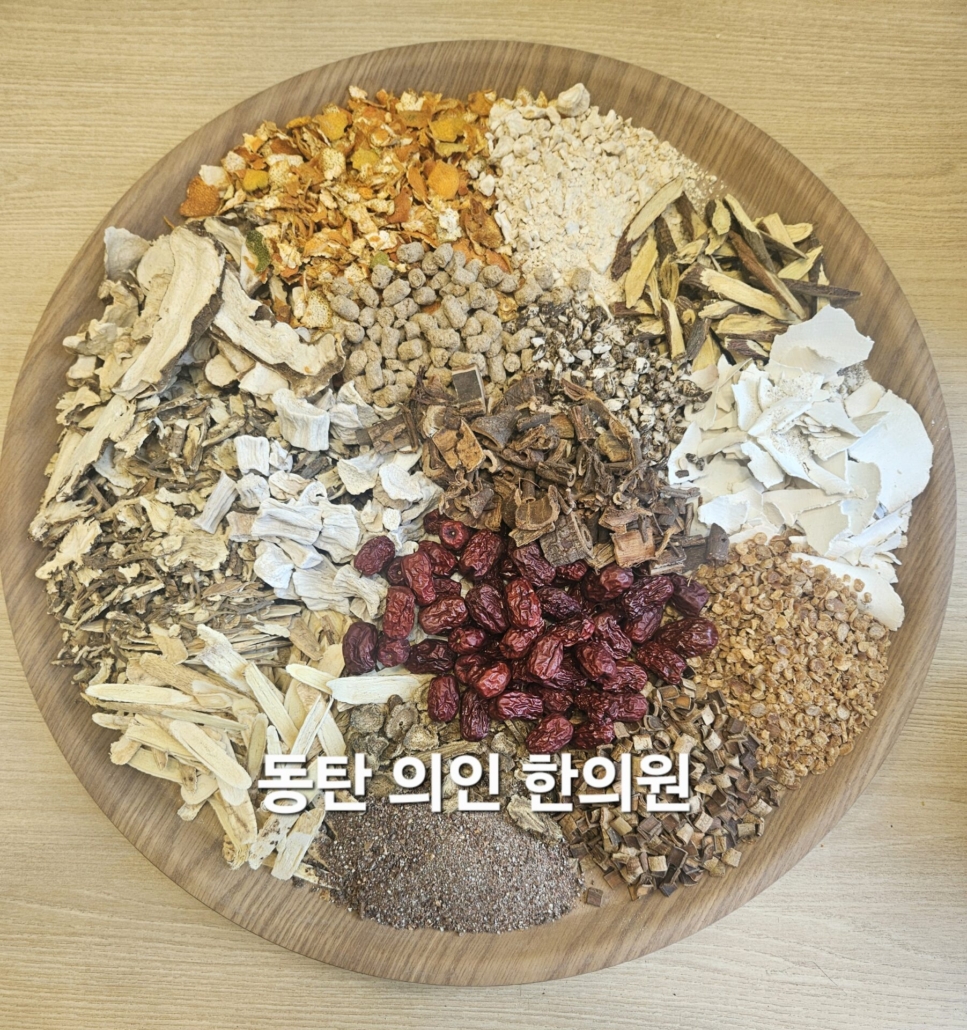 처방은 보기하며 보비위하는 보중익기탕에, 입맛을 돋우며 비위기능의 개선에 초점이 있는 향사육군자탕을 합방하여 구성하였습니다. 당귀 황기는 보기 보혈하며, 함께 약대가 구성될때 보혈하는 효능이 더욱 증대됩니다. 인삼(용출이 용이하게 분쇄함)은 에너지를 보(보기)하며, 복령은 노폐물을 배설하며 심신을 편안하게 하는 역할을 합니다. 향부자는 울결을 풀고, 신곡 사인은 입맛을 돋우는 약재입니다. 산약은 보비위하며 진액을 보하는 역할을 합니다. 처방의 구성이 조화롭고 유기적으로 구성되어 있습니다.